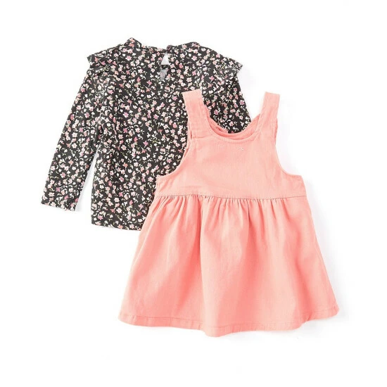 - Solid jumper dress, round neckline, tie shoulder straps, single patch pocket and shirred skirt with two side pockets