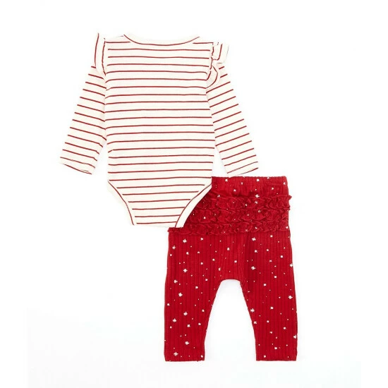 - Striped knit bodysuit with v-neckline, ruffled shoulders, long sleeves, asymmetrical front snap closure and leg snap closures