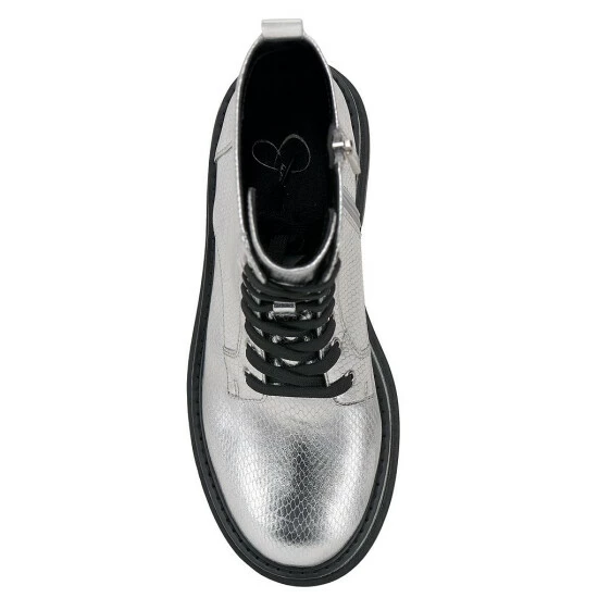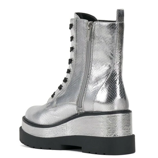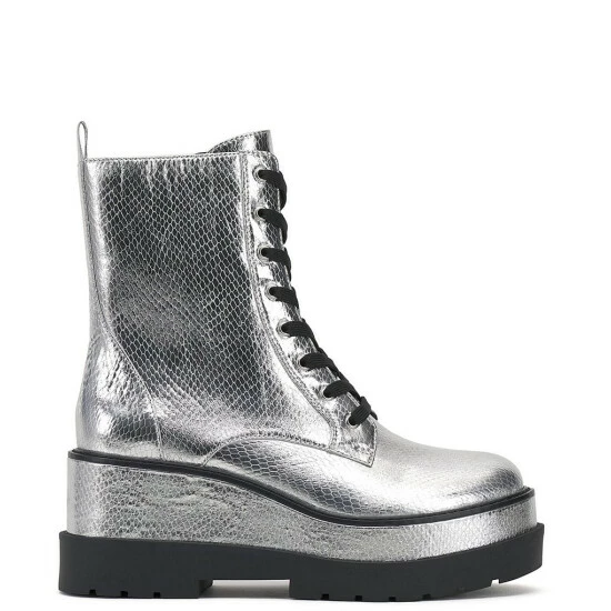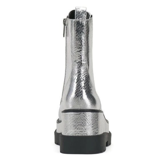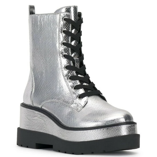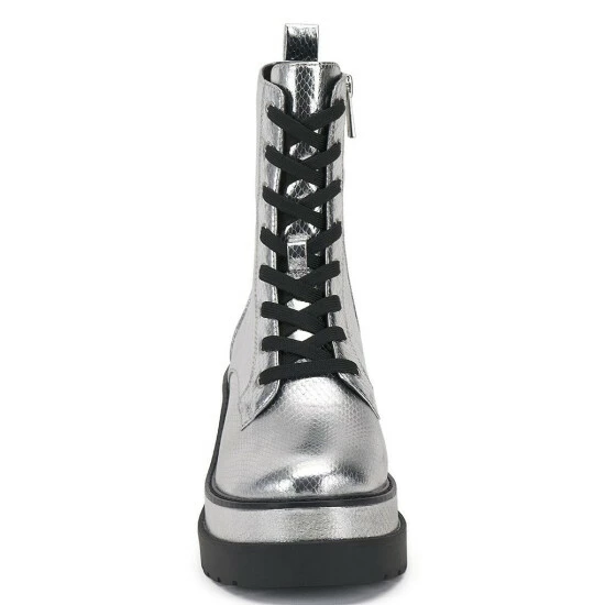 From Jessica Simpson, the Imelda Embossed Metallic Platform Combat Booties feature: