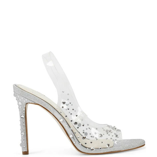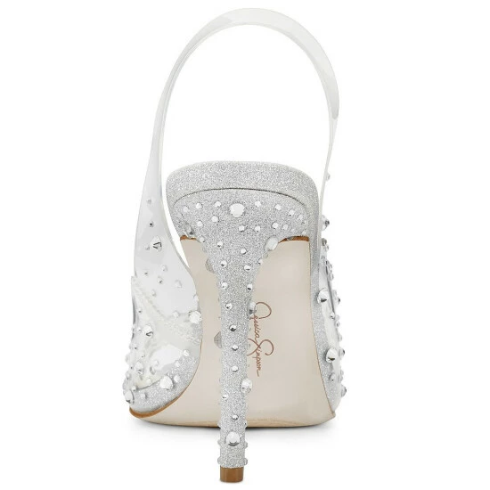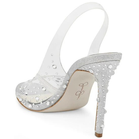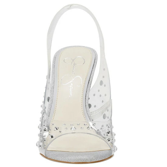 From Jessica Simpson, the Jaisey Clear Rhinestone Slingback Sandals feature: