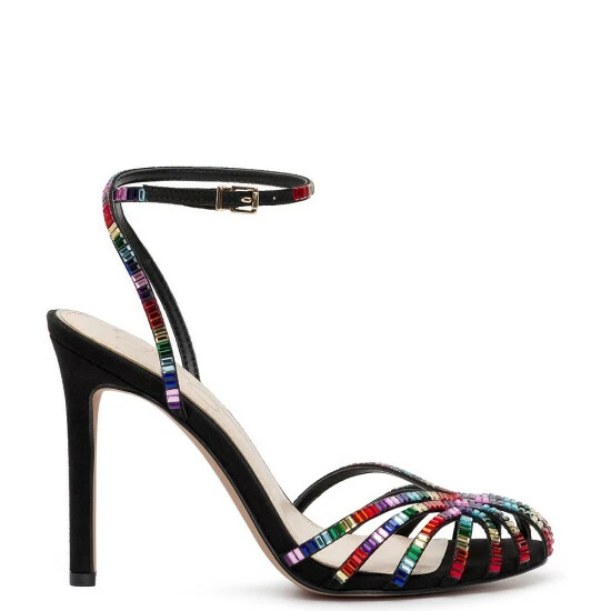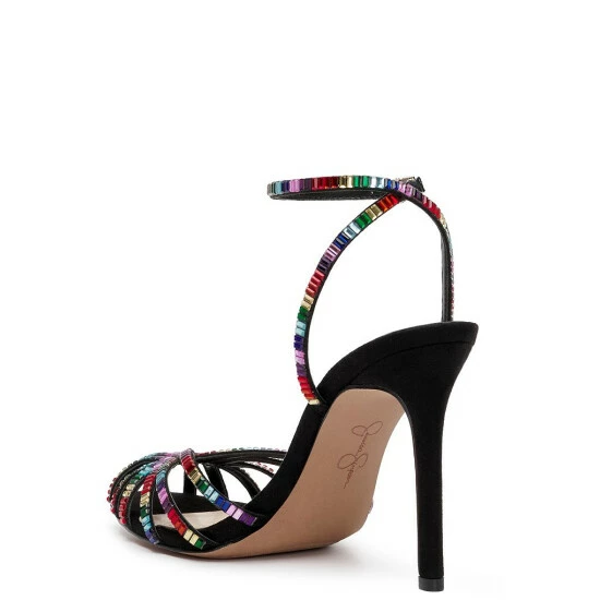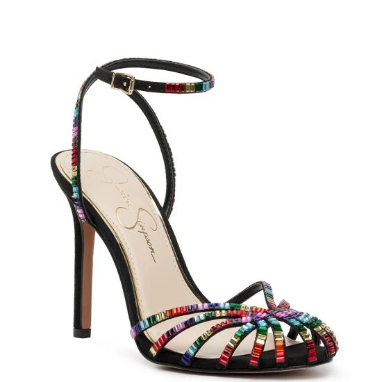 From Jessica Simpson, the Jileta Jewel Embellished Ankle Strap Stiletto Dress Sandals feature: