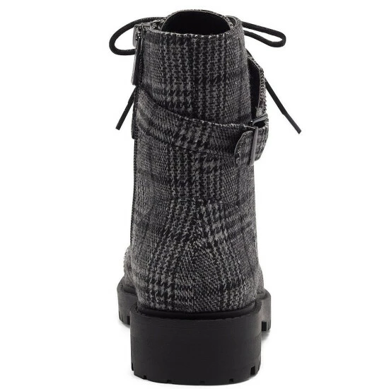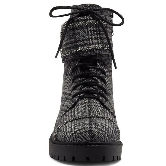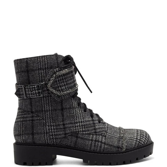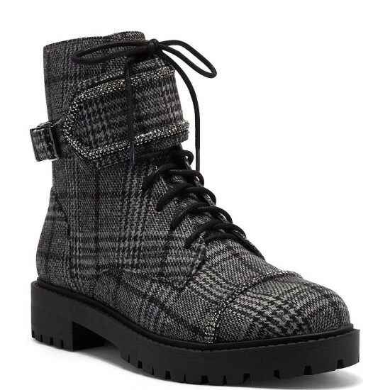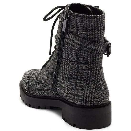 From Jessica Simpson, the Karia Plaid Print Rhinestone Trim Combat Boots feature: