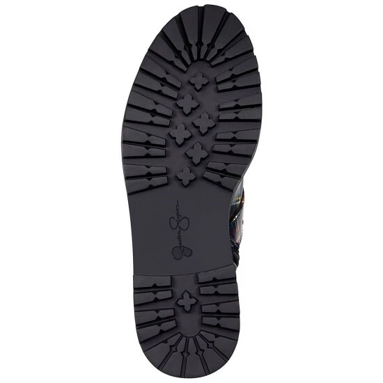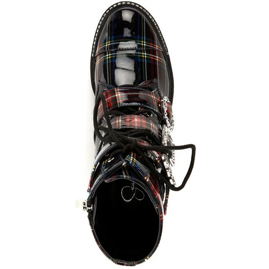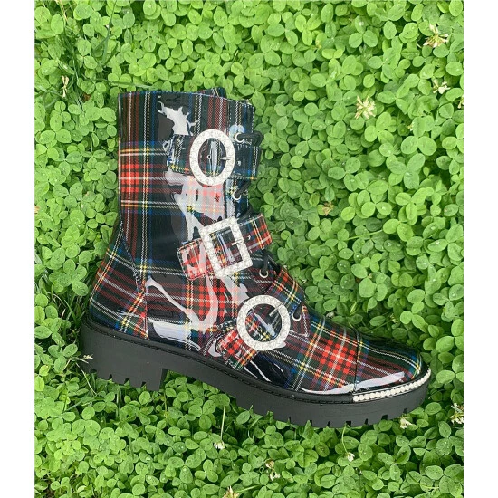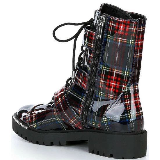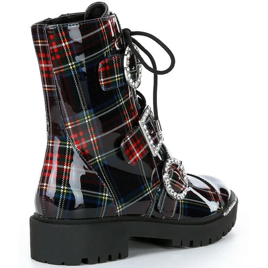 From Jessica Simpson, the Kirlah Rhinestone Buckle Detail Plaid Chunky Lug Sole Combat Boots feature: