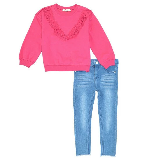 - Solid slub French terry pullover, round neckline, drop shoulder, long sleeve, eyelet ruffle detail on front, pullover styling
