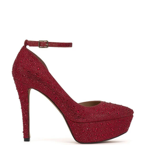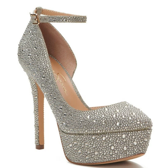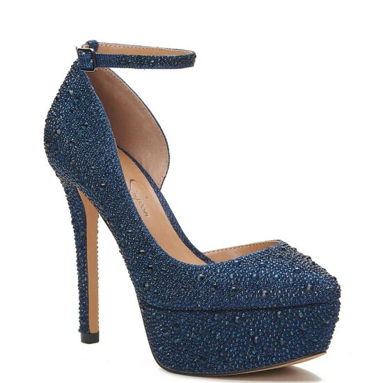 From Jessica Simpson, the Ormanda Rhinestone d’Orsay Ankle-Strap Platform Pumps feature: