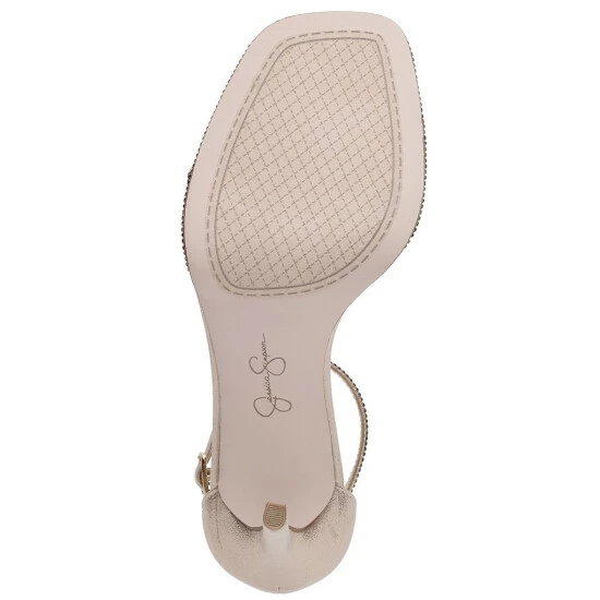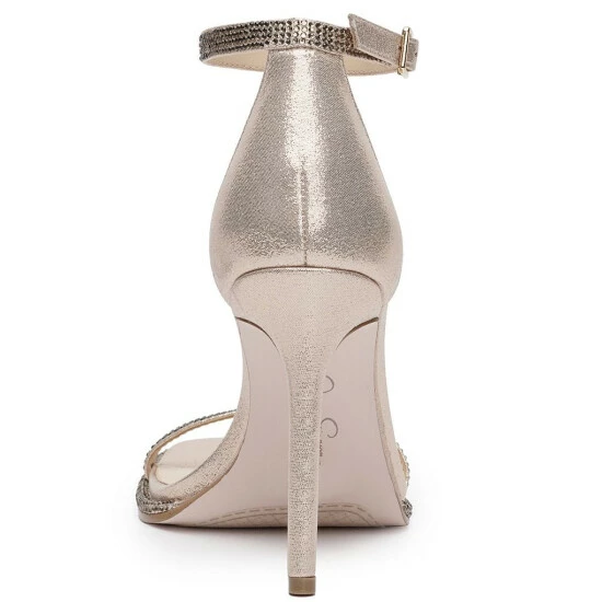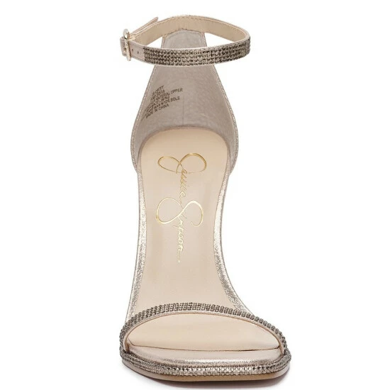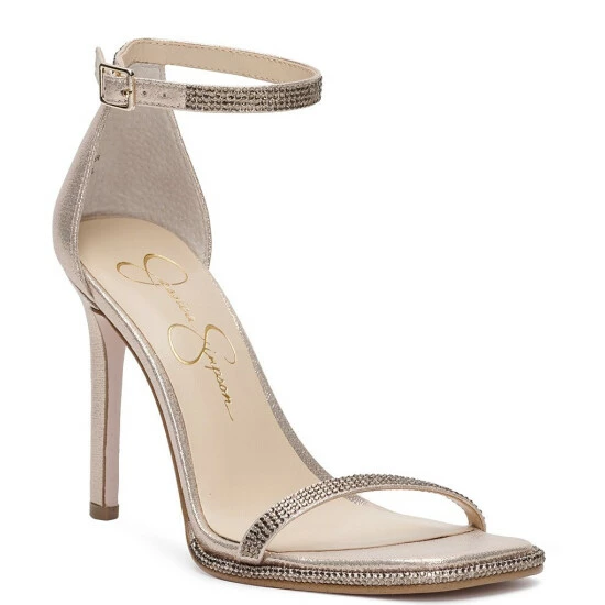 From Jessica Simpson, the Ostey Shimmer Fabric Rhinestone Ankle Strap Dress Sandals feature: