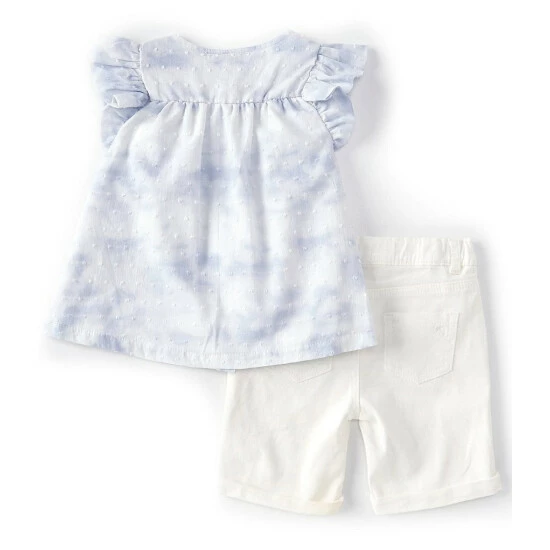 - tie dye clip dot fabrication top with round neckline, flutter sleeves and button front detail